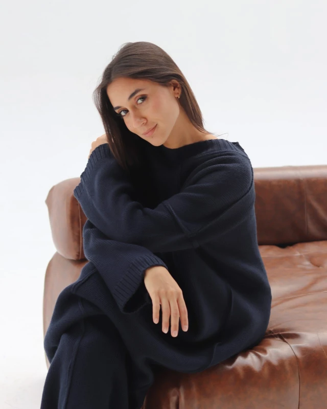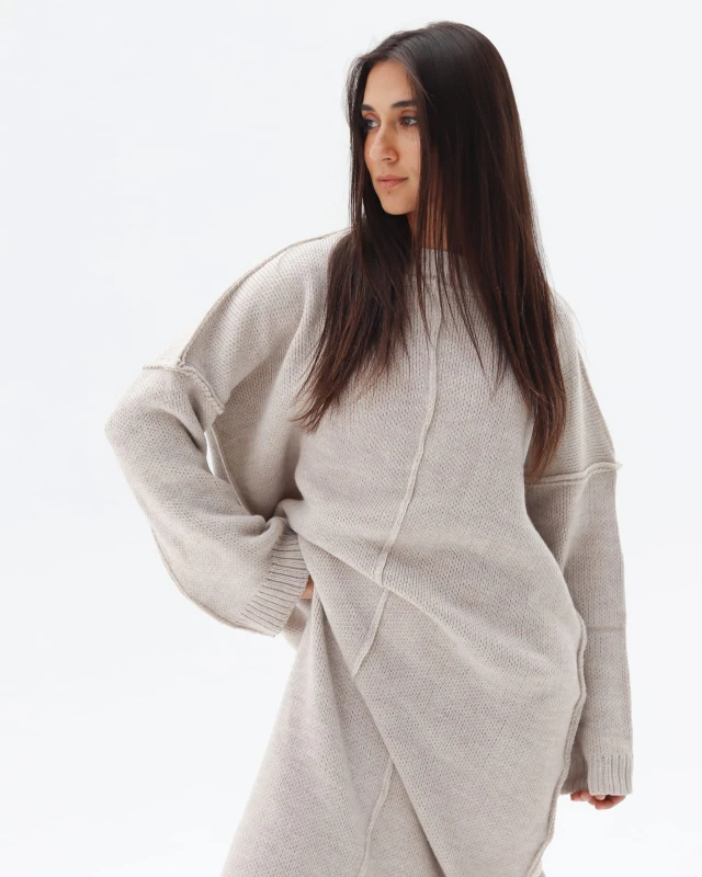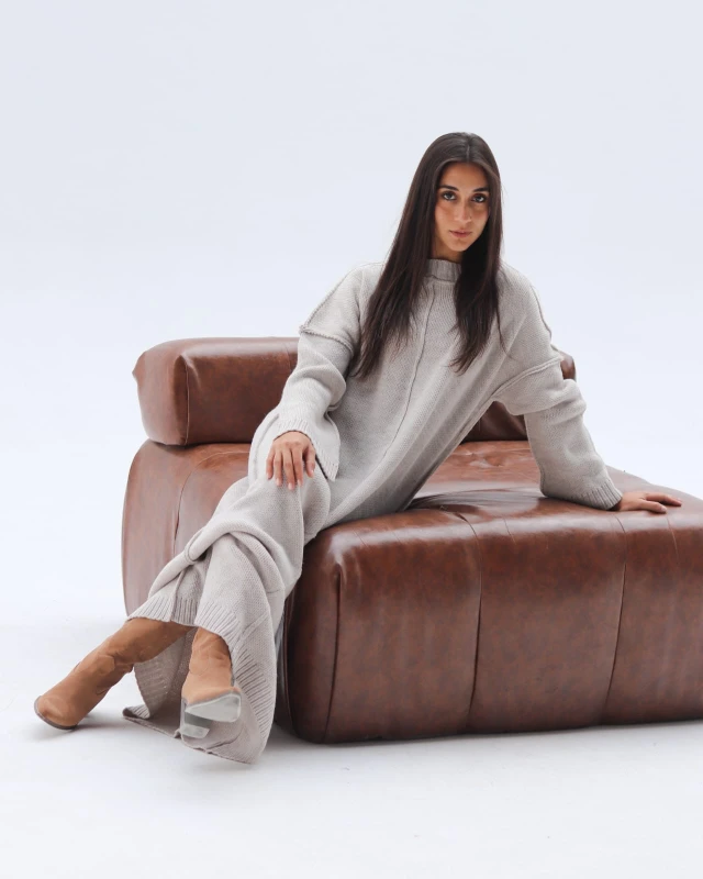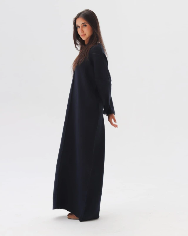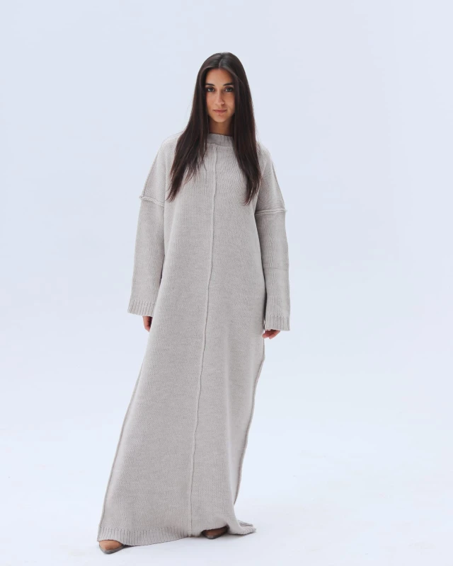فستان ماكسي ناعم ومريح من قماش التريكو، بقصة فضفاضة وأكمام طويلة. مثالي للدفء اليومي وإطلالة أنيقة دون عناء.