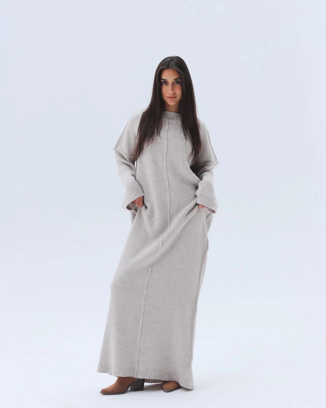 فستان ماكسي ناعم ومريح من قماش التريكو، بقصة فضفاضة وأكمام طويلة. مثالي للدفء اليومي وإطلالة أنيقة دون عناء.