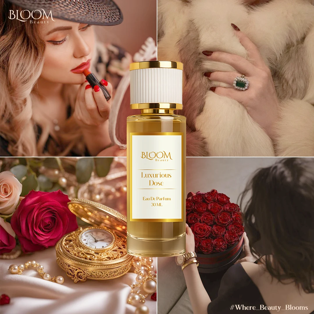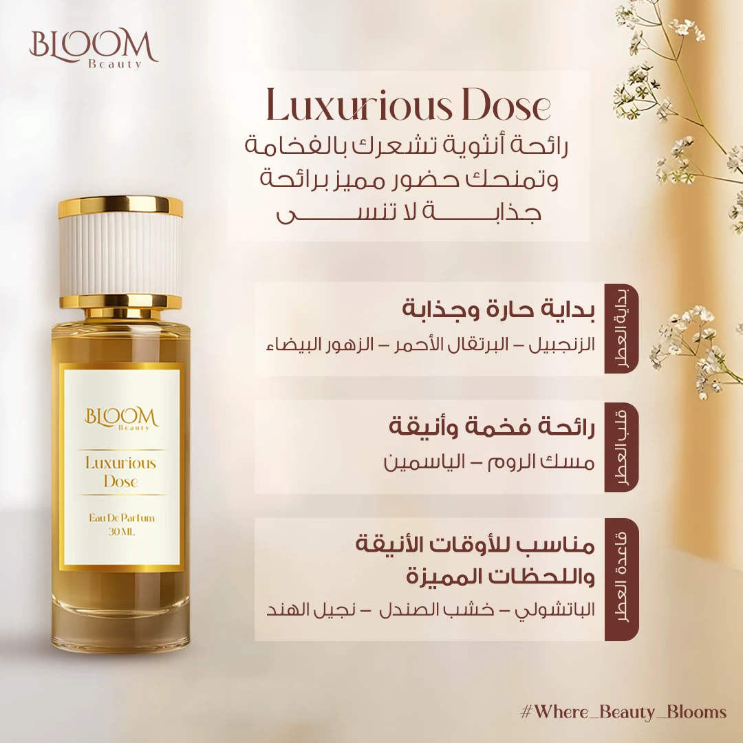 كوني مميزة في أوقاتك الأنيقة مع عطر Luxurious Dose تبدأ رائحته بجرعة من الفخامة والأناقة بالزنجبيل و البرتقال الأحمر بينما ينتهي بلمسات جريئة وأنيقة من الباتشولي و خشب الصندل و نجيل الهند